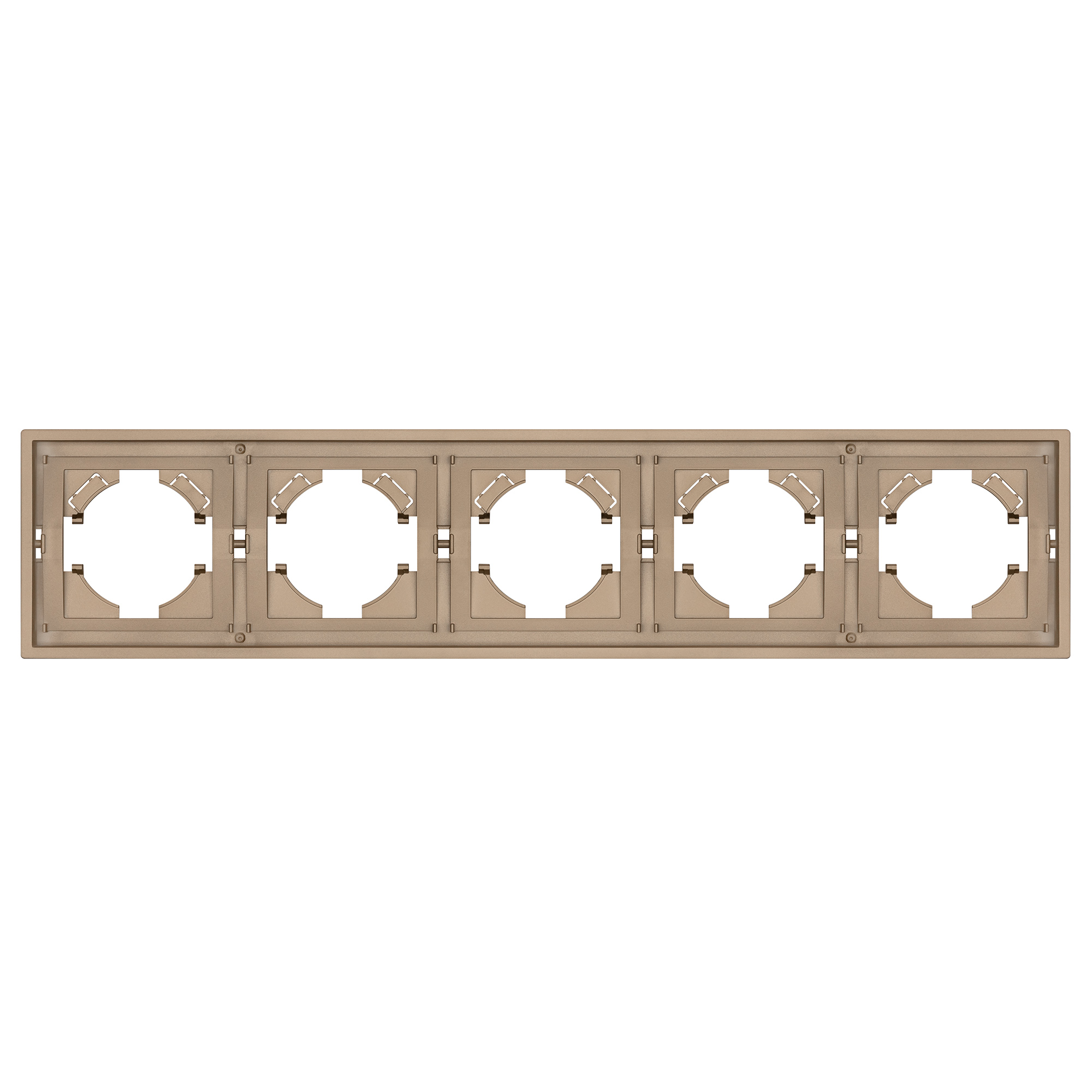Рамка пластиковая на 5 постов, под встраиваемый механизм. Цвет - золотой. Среднего уровня герметичности IP20. Ориентация монтажа горизонтальная.