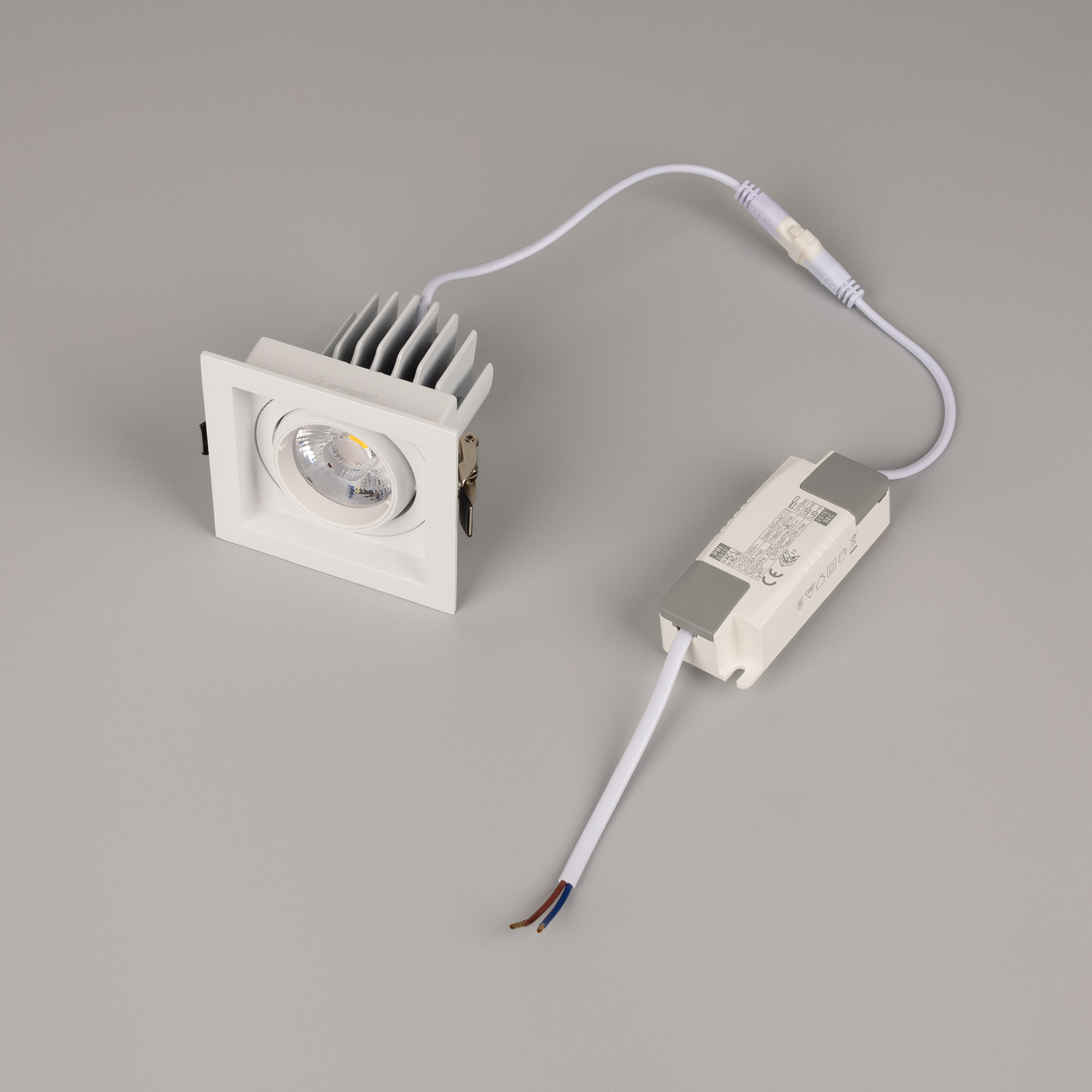 лм/Вт, тёплый 3000 K, CRI>92, угол 20°, напряжение питания 230 В. Белый корпус из алюминия, белая вставка, степень защиты IP20. Размер: длина 90 мм, ширина 90 мм, высота 80 мм. Монтаж встраиваемый, установочное отверстие: длина 75 мм, ширина 75 мм. Драйвер 27-40 В, 300 мА, пульсация <2%.