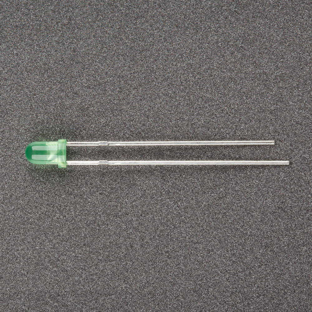 Выводной светодиод круглый, d=3 мм, диффузная зеленая линза.Мигающий, цвет свечения зеленый (525 нм).
